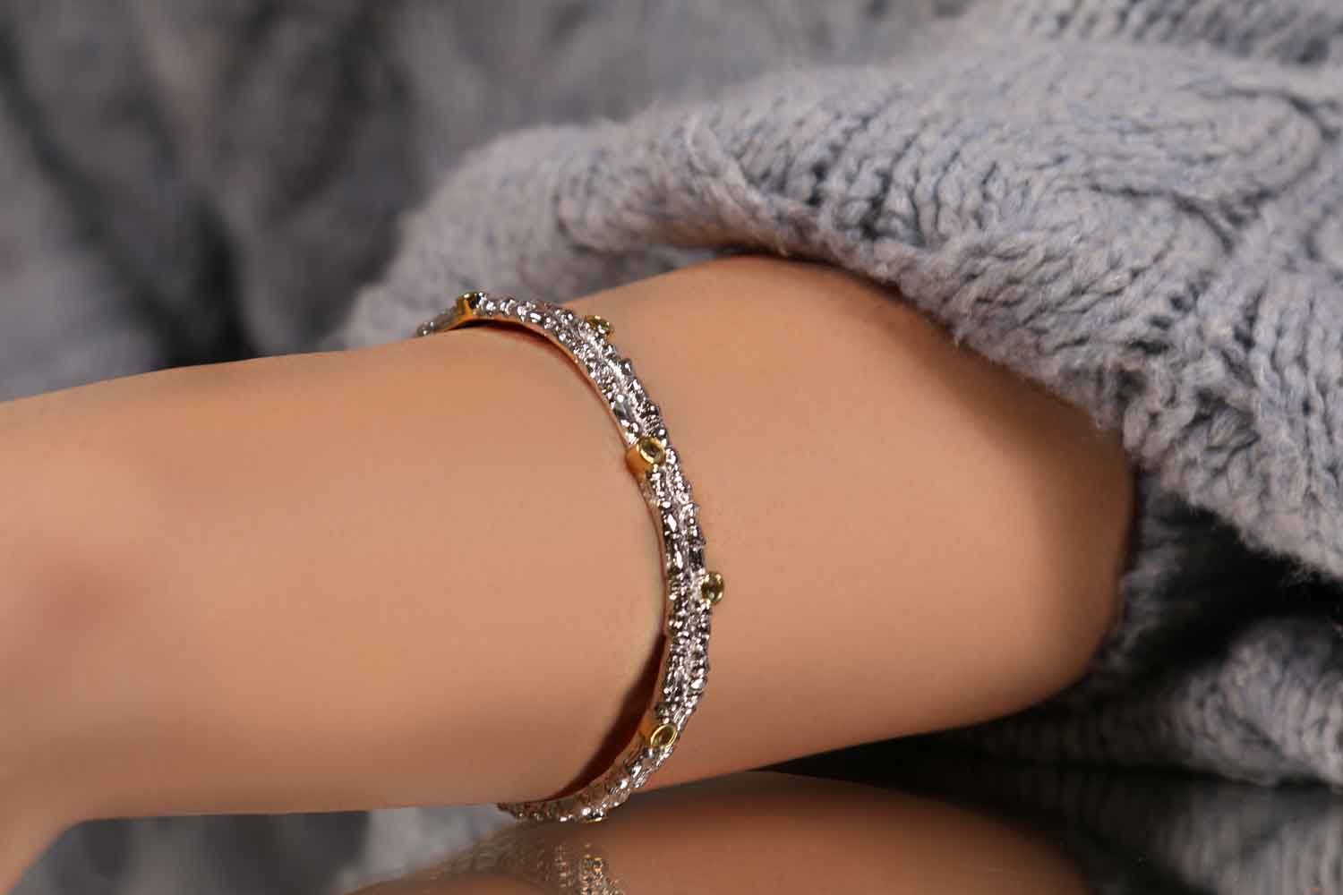 This beautiful unique bangle shines with peridot stones. This stand out piece will never lose its shine.